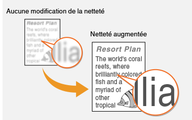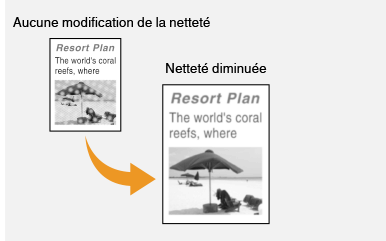 Vous pouvez régler la netteté de l'image. Augmentez la netteté pour améliorer un texte flou ou des lignes floues et diminuez-la pour améliorer l'apparence de photos de magazine. Réglage de la netteté