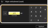 Lorsque vous réglez la position d'impression, spécifiez le sens à l'aide de "+" et "-" et la distance à l'aide de "mm". Pour <Régler verticalement (avant)>/<Régler vertic. (arrière)>, spécifiez une valeur positive ("+") pour décaler la position d'impression de haut en bas. Pour <Régler horiz. (avant)>/<Régler horiz. (arrière)>, spécifiez une valeur positive ("+") pour décaler la position d'impression de gauche à droite. Pour effectuer un décalage dans l'autre sens, spécifiez une valeur négative ("-").