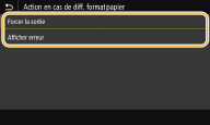 Indiquez si l'impression doit s'effectuer conformément aux paramètres de format et de type de papier définis dans le pilote d'imprimante, et non selon les paramètres définis pour chaque source de papier dans <Réglages papier>, dans l'écran Accueil. En sélectionnant <Activé>, vous pouvez réaliser des impressions depuis la source de papier définie dans le pilote d'imprimante, quels que soient les paramètres de papier définis sur l'appareil. Un message d'erreur peut être configuré pour indiquer si le format papier chargé est très différent de celui qui est défini dans le pilote d'imprimante.