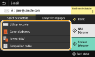 Si vous sélectionnez un destinataire à partir du <Carnet d'adresses> dans l'écran Accueil, l'écran Procédures de base pour l'envoi d'e-mail ou l'envoi de fichier peut s'afficher alors que le destinataire reste spécifié.