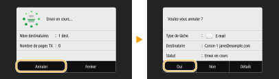 Si vous voulez annuler l'envoi de documents immédiatement après avoir sélectionné <Démarrer>, sélectionnez <Annuler> sur l'écran ou appuyez sur . Vous pouvez également annuler l'envoi de documents après avoir vérifié l'état de l'envoi.