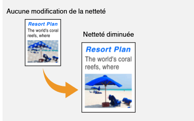 Vous pouvez régler la netteté de l'image. Augmentez la netteté pour améliorer un texte flou ou des lignes floues et diminuez-la pour améliorer l'apparence de photos de magazine.