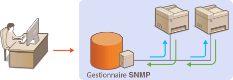 Grâce à SNMP, un ordinateur relié au réseau permet de surveiller et d'obtenir régulièrement les informations de gestion d'imprimante, telles que les protocoles d'impression et les ports d'imprimante.