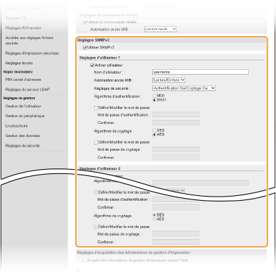 Grâce à SNMPv3, vous pouvez mettre en œuvre une gestion des périphériques réseau protégée par de puissantes fonctions de sécurité. Notez que vous devez activer au préalable le mode TLS pour l'interface utilisateur distante avant de pouvoir configurer SNMPv3 (
