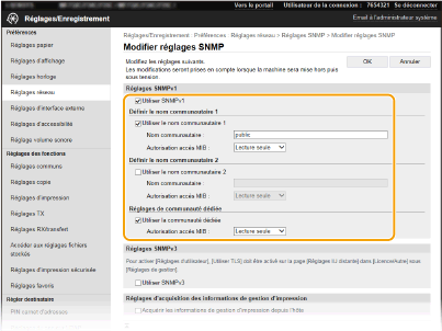 Si les deux versions du protocole SNMP sont activées en même temps, il est recommandé de définir les droits d'accès MIB pour SNMPv1 sur [Lecture seule]. Il est possible de définir différemment les droit d'accès MIB pour les protocoles SNMPv1 et SNMPv3 (ainsi que pour chaque utilisateur dans SNMPv3). Sélectionner [Lecture/Écriture] (tous les droits d'accès) dans SNMPv1 annule les puissantes fonctions de sécurité qui caractérisent SNMPv3, car la plupart des réglages de l'appareil sont alors contrôlés par SNMPv1.