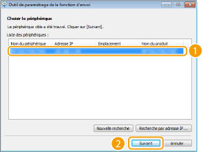 Sélectionnez l'appareil dans [Liste des périphériques ] et cliquez sur [Suivant].