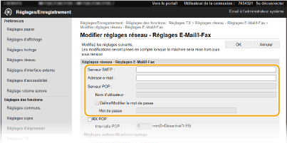 Utilisez l'interface distante pour définir les paramètres détaillés d'envoi et de réception, notamment les paramètres d'utilisation de l'appareil pour l'envoi et la réception des I-Fax et les paramètres d'authentification POP ainsi que le cryptage avant tout envoi d'e-mails ou d'I-Fax. Contactez votre fournisseur ou votre administrateur réseau pour les paramètres requis.