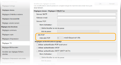Ceci permet de configurer l'intervalle (en minutes) utilisé pour la connexion automatique au serveur POP3. S'il existe des documents I-Fax sur le serveur, ils sont automatiquement reçus et imprimés.