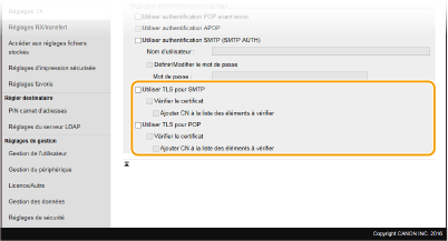 Cochez la case pour utiliser le protocole TLS pour crypter les communications transitant par le serveur SMTP. Cochez la case pour [Vérifier le certificat] ou [Ajouter CN à la liste des éléments à vérifier] en fonction de vos attentes.