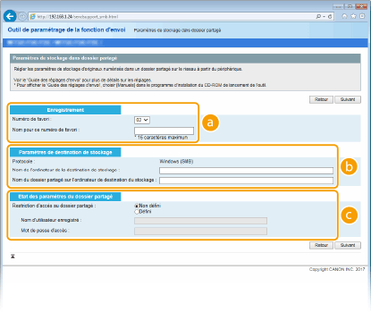 Vous pouvez également utiliser l'interface utilisateur distante pour spécifier l'emplacement du dossier partagé en tant que destination d'enregistrement en le consignant dans le carnet d'adresses. Enregistrement de destinataires depuis l'IU distante