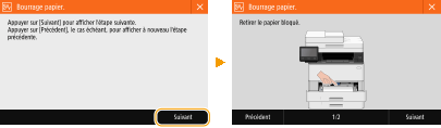 Retirez sans forcer le papier coincé de l'appareilLe retrait en force du papier risque d'endommager des pièces. Si vous ne parvenez pas à enlever le papier, contactez votre revendeur agréé Canon ou composez le numéro d'assistance téléphonique de Canon. Lorsqu'un problème ne peut pas être résolu