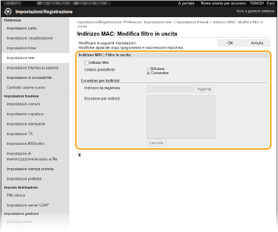 Se gli indirizzi MAC sono immessi in modo non corretto, potrebbe non essere possibile accedere alla macchina dalla IU remota; in questo caso è necessario impostare <Filtro indirizzi MAC> su <Off>. <Filtro indirizzi MAC>