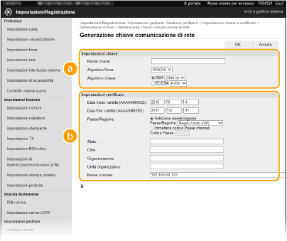 Quando è richiesto per la comunicazione tramite Transport Layer Security (TLS), è possibile generare una chiave e un certificato. È possibile utilizzare TLS quando si esegue l'accesso alla macchina tramite IU remota. I certificati autofirmati vengono utilizzati con la chiave e il certificato generati in "comunicazione di rete".