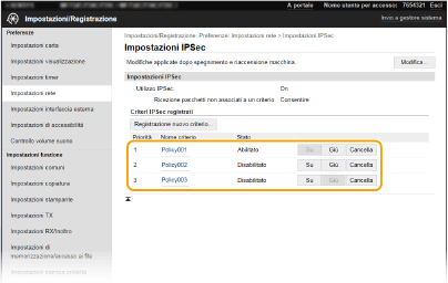Utilizzo del pannello operativoÈ inoltre possibile abilitare o disabilitare la comunicazione IPSec da <Menu> nella schermata Schermata princip.. <Utilizzo IPSec>