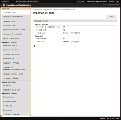 È possibile modificare le varie impostazioni della macchina tramite la IU remota. È inoltre possibile configurare la maggior parte delle impostazioni sulla macchina, ma per alcune è possibile utilizzare solo la IU remota. In questa sezione viene descritto il flusso di lavoro base per modificare le impostazioni della macchina usando la IU remota.