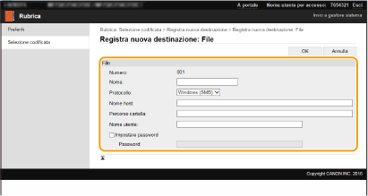 È possibile usare il computer per registrare le destinazioni nella Rubrica della macchina e modificare le informazioni di destinazioni registrate. Specificare qui la cartella condivisa o la destinazione del server FTP.