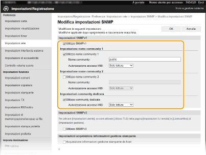 Se SNMPv1 è disabilitata, alcune funzioni della macchina non saranno disponibili, come il conseguimento di informazioni sulla macchina tramite il driver di stampa.
