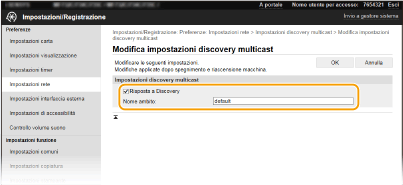 È possibile facilitare la raccolta e la gestione di varie informazioni sui dispositivi di rete implementando un software di gestione delle periferiche, per esempio iW Management Console*, sulla rete. Informazioni come le impostazioni delle periferiche e i registri di errore vengono recuperate e distribuite attraverso il server. Se la macchina è collegata a questo tipo di rete, iW Management Console cerca la macchina nella rete utilizzando protocolli come Service Location Protocol (SLP) per raccogliere informazioni dalla macchina, compreso lo stato di alimentazione. Le impostazioni SLP possono essere specificate attraverso la IU remota. Questa sezione descrive anche la procedura per configurare le impostazioni di comunicazione tra la macchina e i plug-in per iW Management Console.