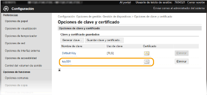 Una clave y un certificado no pueden eliminarse si se utilizan actualmente para algún fin, como cuando aparecen "[TLS]" o "[IEEE 802.1X]" en [Uso de clave]. En este caso, deshabilite la función o sustituya la clave y el certificado antes de eliminarlos.