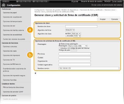 Cuando [SHA384] o [SHA512] están seleccionados en [Algoritmo de firma], [512 bits] no podrá seleccionarse como longitud de clave si está seleccionado [RSA] en [Algoritmo de clave].