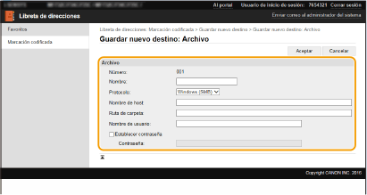 Puede usar el ordenador para registrar destinos en la libreta de direcciones del equipo y editar la información de los destinos registrados. Especifique la carpeta compartida o el destino del servidor FTP aquí.