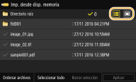 ![]() Si selecciona <Fecha/hora (ascendente)> o <Fecha/hora (descendente)>, los archivos se clasifican en base a las fechas y horas de modificación de los archivos.
