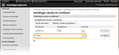 U kunt een sleutelpaar niet verwijderen als dit momenteel in gebruik is, bijvoorbeeld wanneer "[TLS]" of "[IEEE 802.1X]" wordt weergegeven onder [Sleutelgebruik]. In dat geval moet u de functie uitschakelen of het sleutelpaar vervangen voordat u het sleutelpaar kunt verwijderen.