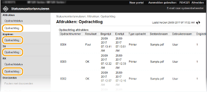 Ongeacht de instelling van Afdeling-ID beheer, bevat de lijst alle afdruktaken die worden afgedrukt en die wachten op afdrukken.