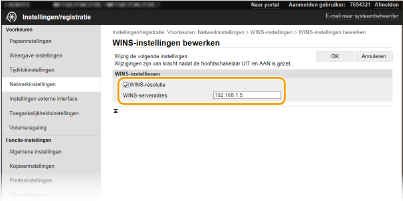 WINS (Windows Internet Name Service) is een service voor naamomzetting waarmee een NetBIOS-naam (de naam van een computer of printer in een SMB-netwerk) wordt gekoppeld aan een IP-adres. U moet de WINS-server opgeven om WINS in te schakelen.