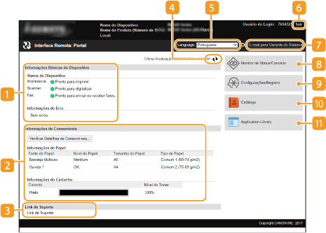 Quando inicia sessão na UI Remota, aparece a seguinte página do portal. Esta secção descreve os itens apresentados na página do portal e as operações básicas.