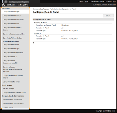 Pode alterar as diferentes definições da máquina utilizando a UI Remota. A maioria das definições também pode ser configurada na máquina, mas algumas definições só podem ser configuradas utilizando a UI Remota. Esta secção descreve o fluxo básico de alteração das definições da máquina utilizando a UI Remota.