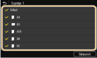 Μπορείτε να ρυθμίσετε τη συσκευή έτσι ώστε να εμφανίζονται στην οθόνη επιλογής ρύθμισης μεγέθους χαρτιού μόνο τα μεγέθη χαρτιού που χρησιμοποιείτε συχνά.