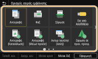 Μπορείτε να προσθέσετε πλήκτρα συντόμευσης στην οθόνη Αρχική για τις λειτουργίες που χρησιμοποιείτε συχνά, π.χ. <Αντιγραφή>, <Φαξ> και <Σάρωση>. Για παράδειγμα, μπορείτε να εκτελείτε τις εργασίες που θέλετε πιο γρήγορα και πιο αποτελεσματικά εκχωρώντας μια σειρά ρυθμίσεων (π.χ. σάρωση και των δύο όψεων ενός εγγράφου, αποθήκευση σε μορφή αρχείου PDF υψηλής συμπίεσης και αποστολή με e-mail) σε ένα μόνο πλήκτρο.