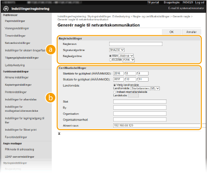 Der kan genereres en nøgle og et certifikat med maskinen, når det er nødvendigt til krypteret kommunikation via TLS (Transport Layer Security). Du kan bruge TLS, når du har adgang til maskinen via Brugerinterface til fjernbetjening. Der bruges selvsignerede certifikater med den nøgle og det certifikat, der er blevet genereret i "Netværkskommunikation".