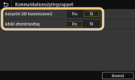 Vælg <Til> for at udskrive rapporten automatisk efter hver 40 afsendelser eller <Fra>, hvis du ikke vil udskrive rapporten automatisk.