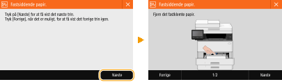 Når du fjerner det fastklemte papir, må du ikke slukke maskinenHvis du slukker for maskinen, slettes de data, der er ved at blive udskrevet. Vær særdeles omhyggelig, når du modtager faxdokumenter.