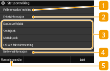 Når du trykker på <Statusoverv.>, vises et skjermbilde som lar deg sjekke fremdriften for dokumenter som skrives ut samt statusen til maskinen (gjenværende toner osv.) og nettverksinnstillingene som for eksempel maskinens IP-adresse.