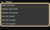 Hvis skjermbildet vist over ikke vises når papir er lagt innHvis du alltid legger i samme papir i flerfunksjonsskuffen, kan du hoppe over innstilling av papir ved å registrere papirformatet og -typen som standardinnstillingen. Når standardinnstillingen er registrert, vises derimot ikke skjermbildet vist over. For å vise skjermbildet, velger du <Angi når papir lastes> (Registrere standard papirinnstillinger for flerfunksjonsskuffen).