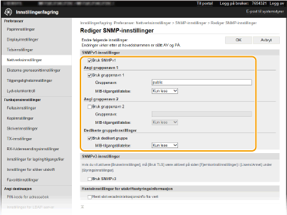 Velg [Lese/skrive] eller [Kun lese] for hver gruppe, for tilgangsrettigheter til MIB-objekter.