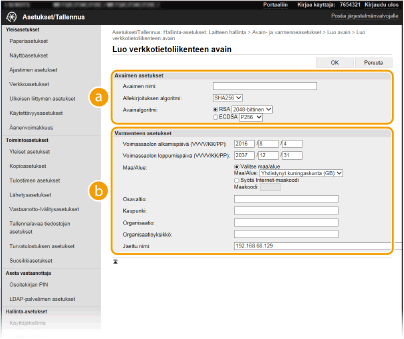Avain ja varmenne voidaan luoda laitteen avulla, kun sitä vaaditaan salattuun TLS (Transport Layer Security) -tiedonsiirtoon. Voit käyttää TLS-salausta, kun käytät laitetta etäkäyttöliittymällä. Verkkotietoliikenne-kohdassa luodun avaimen ja varmenteen kanssa käytetään itse allekirjoitettuja varmenteita.