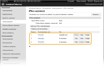 Käyttöpaneelin käyttäminenVoit ottaa IPSec-tiedonsiirron käyttöön tai poistaa sen käytöstä myös Koti-näytön kohdassa <Valikko>. <Käytä IPSec-muotoa>
