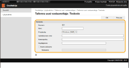 Voit käyttää tietokonetta vastaanottajien tallentamiseen laitteen osoitekirjaan ja tallennettujen vastaanottajien tietojen muokkaamiseen. Määritä jaettu kansio tai FTP-palvelimen vastaanottaja tässä.