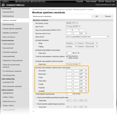 *Jos virtaa ei voi katkaista automaattisesti määritettynä aikana, sitä yritetään uudelleen enintään kymmenen kertaa yhden minuutin välein. Jos virtaa ei voi katkaista edes kymmenen uudelleenyrityksen jälkeen, automaattista sammutusta ei voi suorittaa kyseisenä päivänä.