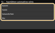 Ota käyttöön tai pois käytöstä paperilähteen automaattinen valitsemistoiminto joka paperilähdettä varten. Jos ominaisuuden asetukseksi valitaan <Kyllä>, laite valitsee automaattisesti paperilähteen, johon on lisätty tulostustyölle sopivan kokoista paperia. Lisäksi kun paperi loppuu valitusta paperilähteestä, tämän ominaisuuden avulla tulostusta voidaan jatkaa vaihtamalla yhdestä paperilähteestä toiseen, johon on lisätty samaa paperikokoa.