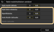 Tämän avulla voit tulostaa vastaanotin tulosraportit aina, kun asiakirjoja tallennetaan muistiin. Tulosta raportit valitsemalla <Kyllä>. Lisäksi <Vastaanoton tulosraportti> ‑asetukseksi täytyy valita <Kyllä>.