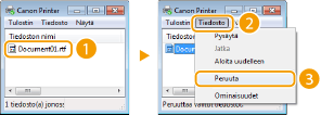 Peruuttaminen sovelluksestaJoissakin sovelluksissa esiin tulee alla näytetyn kaltainen näyttö. Voit peruuttaa tulostuksen napsauttamalla [Peruuta].