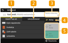 Valitse tämä välilehti, kun haluat etsiä osoitekirjassa tai LDAP-palvelimella olevaa vastaanottajaa, syöttää lyhytvalintanumeron tai määrittää vastaanottajan käyttämällä takaisinsoittoasetuksia.