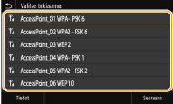 Voit etsiä yhteyden muodostukseen käytettävissä olevia langattomia reitittimiä (tai liityntäpisteitä) ja valita sellaisen laitteen näytöstä. Syötä verkkoavaimeksi WEP-avain tai PSK. Ennen kuin valitset langattoman reitittimen, tarkista ja kirjoita muistiin tarvittavat asetustiedot, mukaan lukien SSID ja verkkoavain (