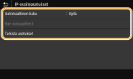 Varmista, että <Automaattinen IP> -asetukseksi on valittu <Kyllä>.