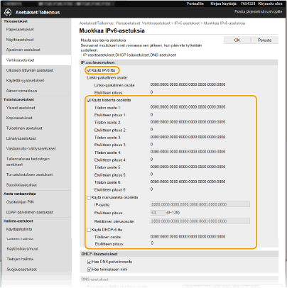 Laitteen IPv6-osoitteet voidaan määrittää etäkäyttöliittymän avulla. Tarkista IPv4-osoiteasetukset ennen IPv6-osoitteiden asettamista (IPv4-asetusten näyttäminen). Sinun on asetettava oikeat IPv4-asetukset, jotta voit käyttää IPv6-osoitteita. Huomaa, että skannaustoiminto, joka käyttää skanneriajuria tai MF Scan Utility -ohjelmaa, ei ole käytettävissä IPv6-ympäristössä. Laite voi käyttää seuraavia useita IPv6-osoitteita:
